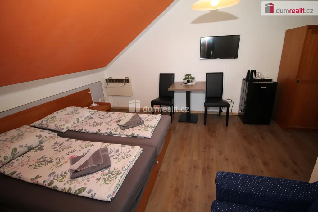 Dumrealit.cz Vám zprostředkuje koupi zavedeného hotelu s restaurací přímo na sjezdu z dálnice D6 směr Odrava u čerpací stanice MOL, kde je dostatek parkování s velkým pozemkem 3880 m². Budova dle architektonického návrhu postavená před 25 lety je ve výborném stavu, je z červených pálených cihel a fasáda je zateplená. Elektroinstalace je již v mědi, jsou zde 3 fáze, 220 V, 380 V. Budova je připojena na veškeré inženýrské sítě včetně kanalizace, elektřiny, plynu i vodovodního řadu. Vytápění a ohřev teplé vody zajišťuje plynový kotel. V přízemí je restaurace s kapacitou pro 50 - 80 osob uvnitř, 50 osob na terase, dále je zde bar, vybavená kuchyně, sociální zařízení pro personál, pro hosty, dále sklad, výlevka. V přízemí je dále také samostatný byt 2+kk, který je přístupný ze zadní strany samostatným vchodem. V prvním patře je 8 dvoulůžkových pokojů každý s vlastní koupelnou se sprchou toaletou a umyvadlem, které jsou plně vybavené nábytkem, minilednicí, TV apod., nyní jsou pokoje dlouhodobě obsazené. Ve druhém patře je podkrovní prostor, který slouží jako sklad, dále je zde pokoj, který je možný využít na ubytování, v současnosti se nepoužívá. Objekt je podsklepený, je zde technické zázemí a velká suchá místnost, cca 50 m², která se dá samostatně pronajímat, nyní také slouží jako sklad (opravovaly se zde kola). Ze zadní části budovy je únikové schodiště. Taktéž je v zadní části domu samostatná terasa, další parkoviště. Rozlehlý pozemek nabízí možnost variabilního vybudování prostoru pro parkování. Parkování je také možné na benzínce, u objektu je další velké parkoviště, které je možné si pronajímat. Místo je svou polohou ideální pro vybudování funkčního dlouhodobého podnikání. Cena zahrnuje provizi RK a právní servis. Ev. číslo: 656091.