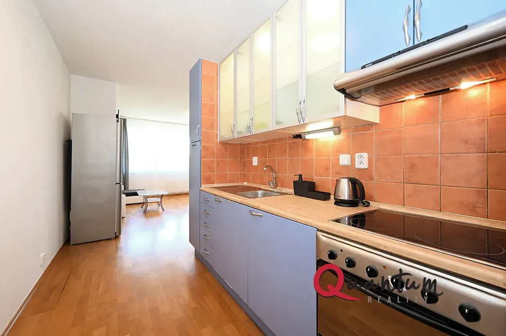 Dispozice bytu tvoří prostorný a velmi světlý obývací pokoj propojený s kuchyňským koutem. Obývací část je vybavena rozkládacím gaučem, jídelním stolem a televizí. Kuchyňský kout disponuje troubou, sklokeramickou varnou deskou, digestoří a lednicí, takže poskytuje vše potřebné pro pohodlné každodenní vaření.