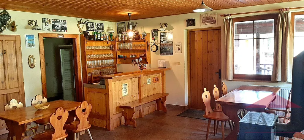 Popis: chladný sklep, pivo sudy 15 m2; přízemí 234 m2: vstup přes velkou částečně zastřešenou terasu 87 m2; stylová restaurace - pivnice 46 m2 (výčep, krbová kamna, WC) vybavená kuchyň s digestoří 17 m2; apartmán č.1 (2+kk, 25 m2); apartmán č.2 (2+kk, 30 m2) oba přístupné z terasy; apartmán č.3 (2+kk; 33,4 m2) vlastní vstup; apartmán č.4 (1+kk; 22 m2; byt správce vstup z restaurace), kotelna; sociální zařízení pro kemp 42 m2 s vlastním vstupem, které lze upravit na další apartmán. Objekt je na betonovém, vyvýšeném soklu cca 80 cm, chráněný před záplavami, vč. 100leté vody.
