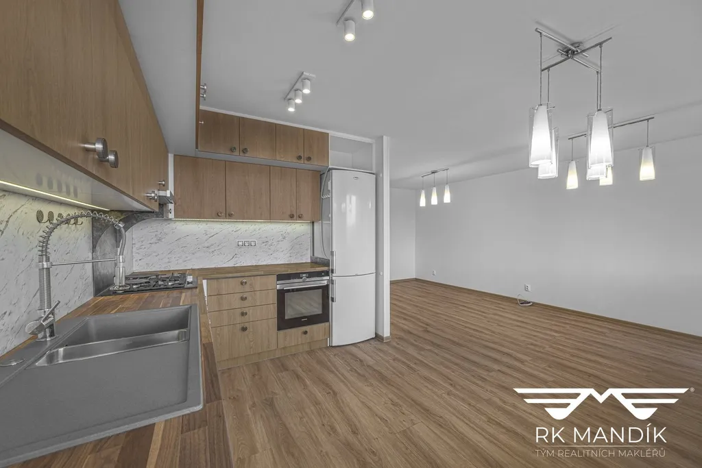 Dispozici tvoří prostorný obývací pokoj s plně vybaveným kuchyňským koutem o výměře 28,91 m² orientovaný na jižní stranu, odkud je přímý vstup na zasklenou lodžii o ploše 6,96 m². Kuchyňská linka je osazena plynovou varnou deskou, digestoří s odvodem, elektrickou troubou, myčkou nádobí a kombinovanou lednicí s mrazákem.