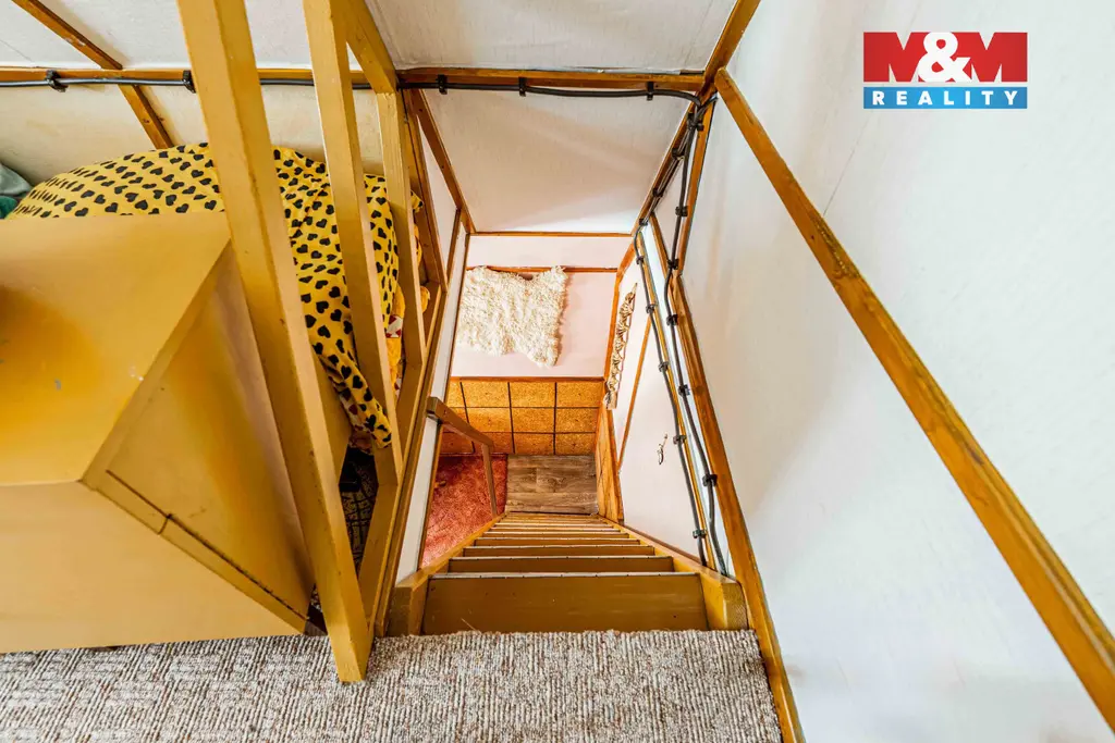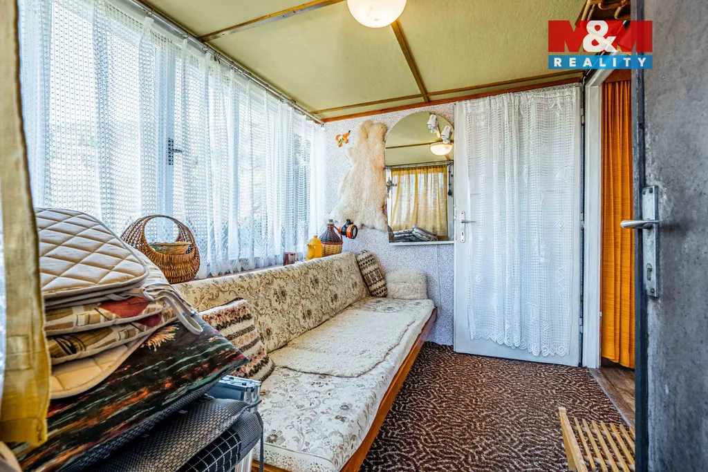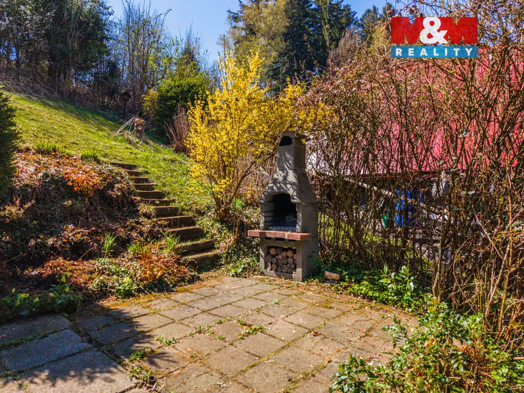Chata o užitné ploše 32m² je postavená ve svahu, takže je potřeba se připravit na časté vybíhání schodů. Zahrada má 422m².