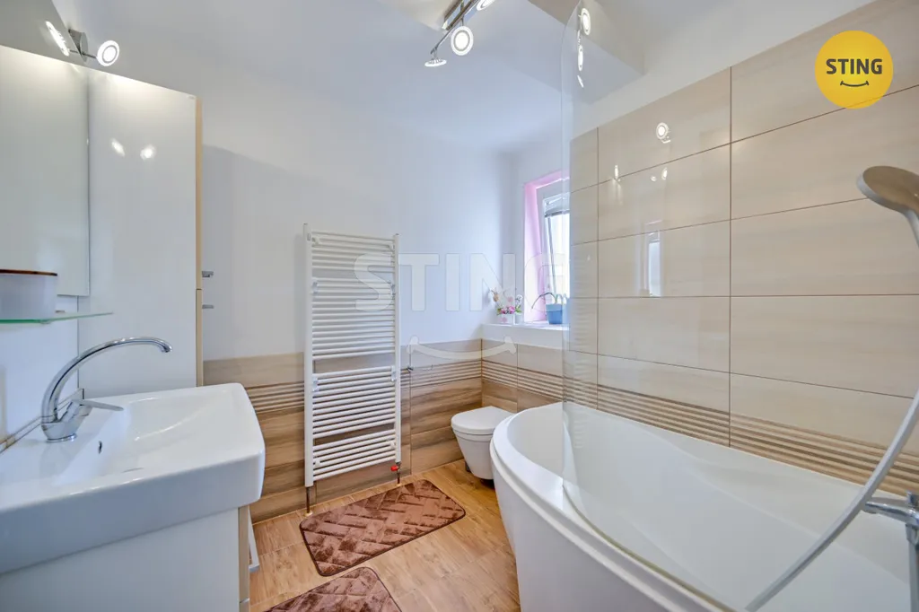 - Obývací pokoj je propojený s kuchyní, byt je bezbariérový a nabízí prostornou koupelnu s vanou.