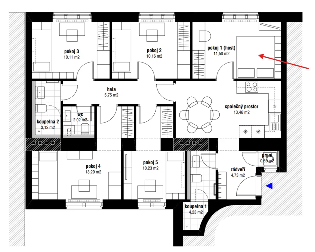 Jako všechny ostatní pokoje je i tento neprůchozí a nabízí tak nájemníkovi příjemné soukromí.