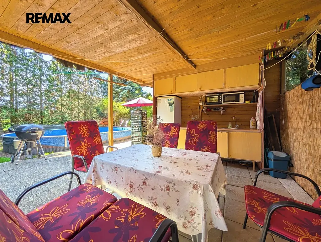 Pozemek je rovinatý a rozdělený do tří funkčních částí – odpočinkové, okrasné a užitkové. Celý areál působí velmi harmonicky a díky vzrostlým stromům nabízí maximální soukromí. Přístup k pozemku je zajištěn po obecní cestě.