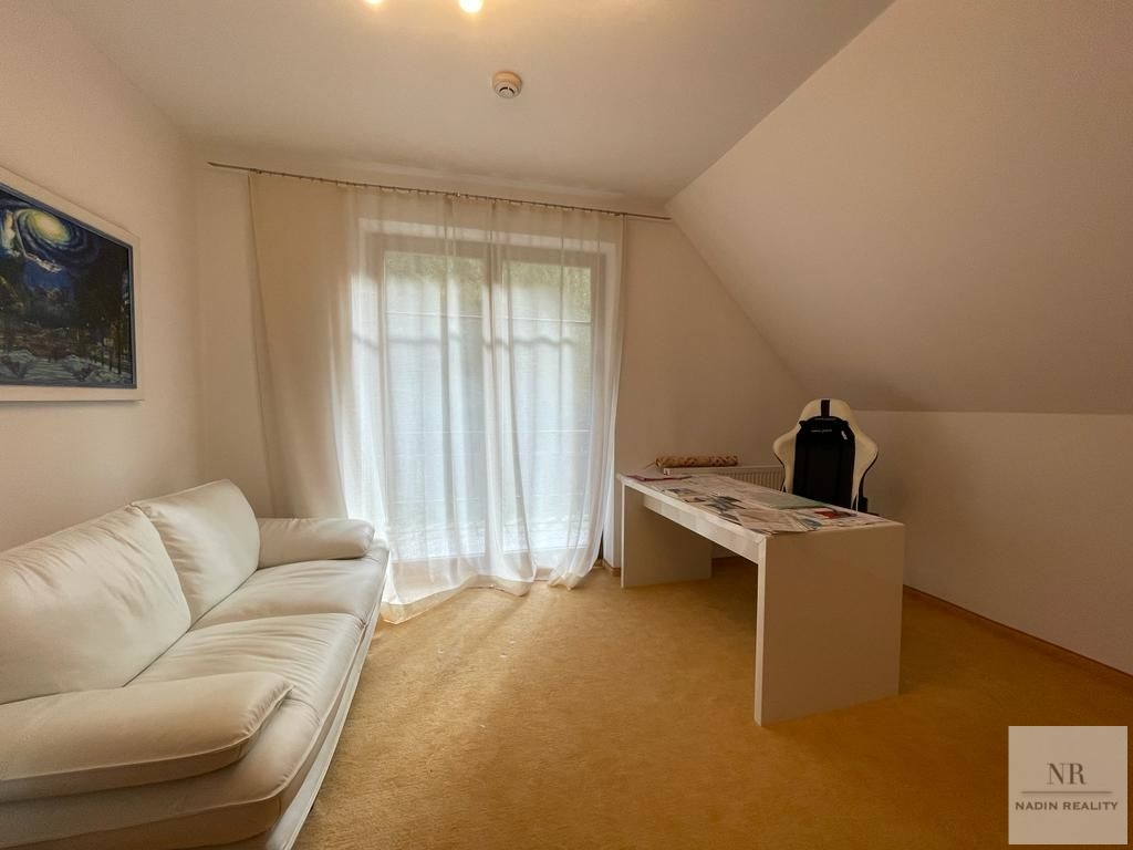 Dům je disponován na dvě patra, v podkoví mansarda.V přízemí domu je prostorný obývací pokoj, velká kuchyně s vestavěnými spotřebiči, jídelna s krbem, vstupní hala a koupelna se sprchovým koutem s WC. Ve druhém patře jsou 3 pokoje, balkón a koupelna se sprchovým koutem. V přízemí je podlahové topení.