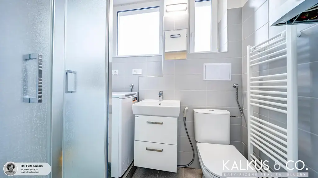 Dobře větratelná koupelna se dvěma okny je vybavena sprchovým koutem, pračkou, umyvadlem se skříňkou, WC a topným žebříkem. Vytápění a ohřev vody zajišťuje zánovní plynový kotel s pravidelným servisem a revizemi. K bytu náleží také prostorný sklep a k dispozici je internet.