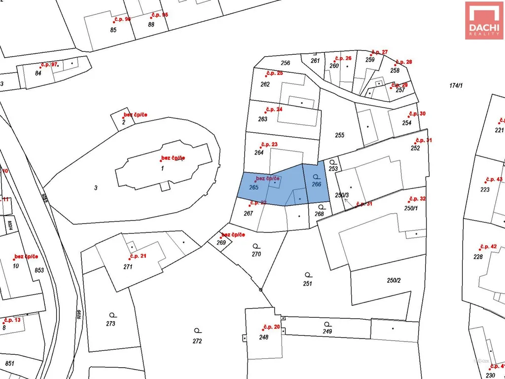 Pozemek je tvořen dvěma parcelami parc. č. 265 o výměře 264 m a parc. č. 266 o výměře 106 m, o celkové rozloze 370 m. Obě parcely se nacházejí v zastavitelném území dle územního plánu, což zajišťuje možnost výstavby.
