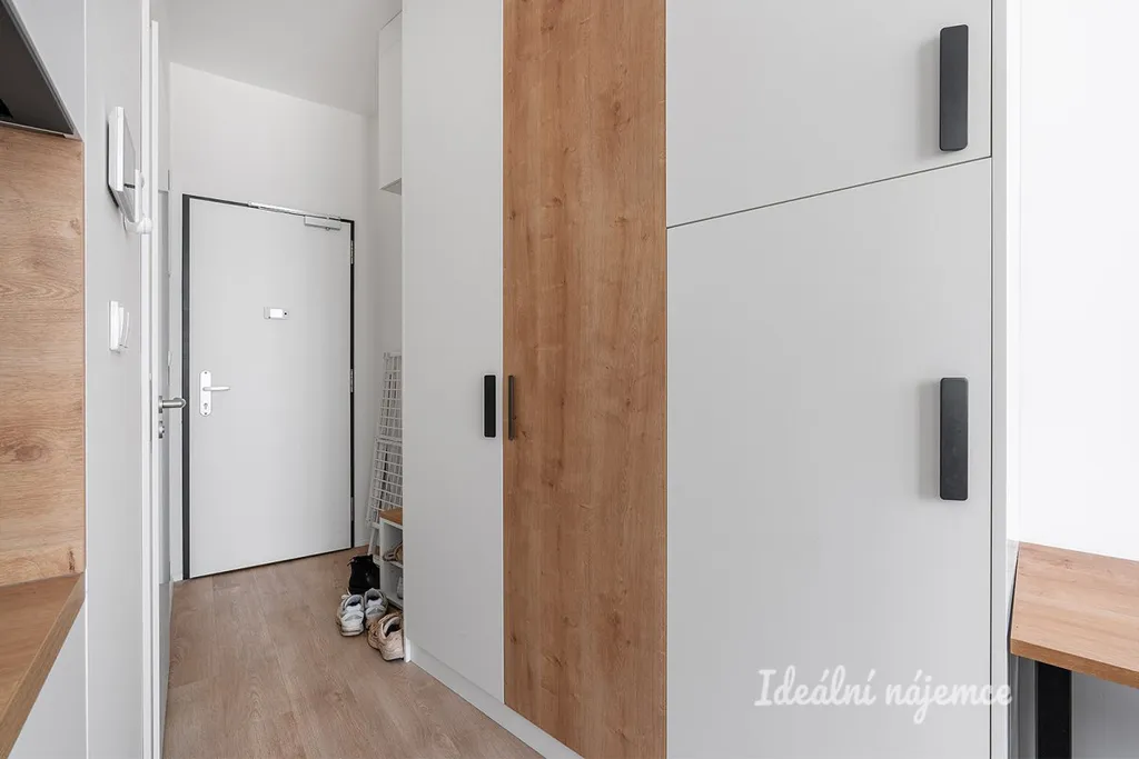 Kuchyně je vybavena myčkou, troubou, elektrickou dvouploténkou a digestoří. Dále je zde vestavná lednice. V chodbě se nachází vestavná šatní skříň.