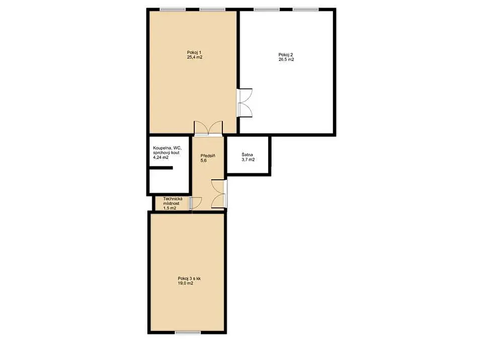 Vstupte do bytu, který se pyšní promyšlenou dispozicí a velkorysým prostorem, čekajícím na vaši osobní vizi. Najdete zde předsíň o velikosti přibližně 5,6 m2, praktickou šatnu s plochou zhruba 3,7 m2 a moderní koupelnu se sprchovým koutem a WC o rozloze přibližně 4,24 m2. Nechybí ani technická místnost, kde je umístěn vlastní plynový kotel a pračka, s velikostí zhruba 1,5 m2. Obývací pokoj s kuchyňským koutem, měřící přibližně 19,0 m2, nabízí klidný výhled do vnitrobloku, zatímco dva další prostorné pokoje s výhledem do ulice disponují plochou cca 25,4 m2 a 26,5 m2. Vytápění a ohřev vody zajišťuje vlastní plynový kotel, což garantuje efektivitu a komfort. Tento byt představuje skvělou příležitost pro kompletní rekonstrukci dle vašich představ, díky které si vytvoříte domov přesně na míru. Přesnou dispozici bytu si můžete prohlédnout na půdorysu v sekci fotografií.