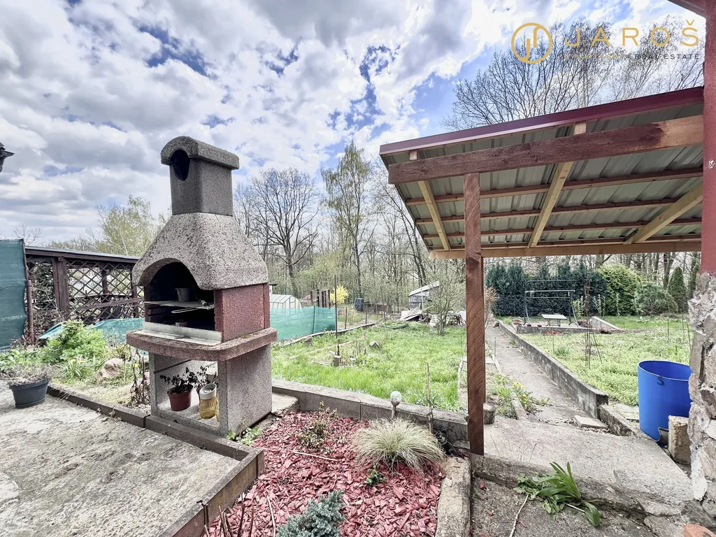 Na pozemku se nachází několik ovocných stromů, venkovní posezení s krbem, nové zastřešení a praktická kůlna na nářadí.
