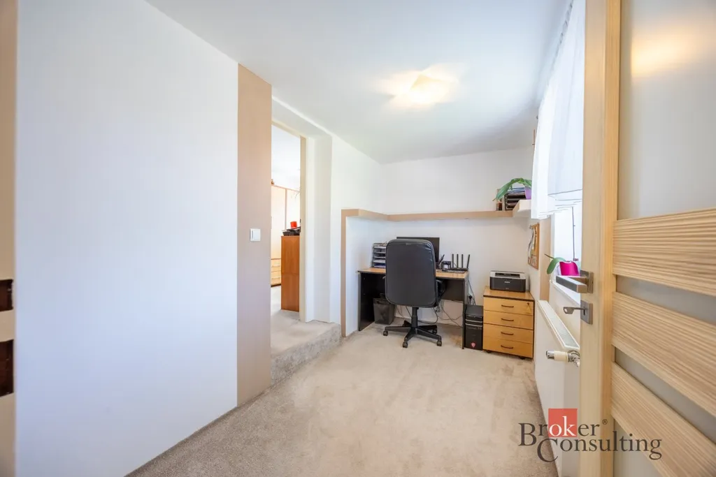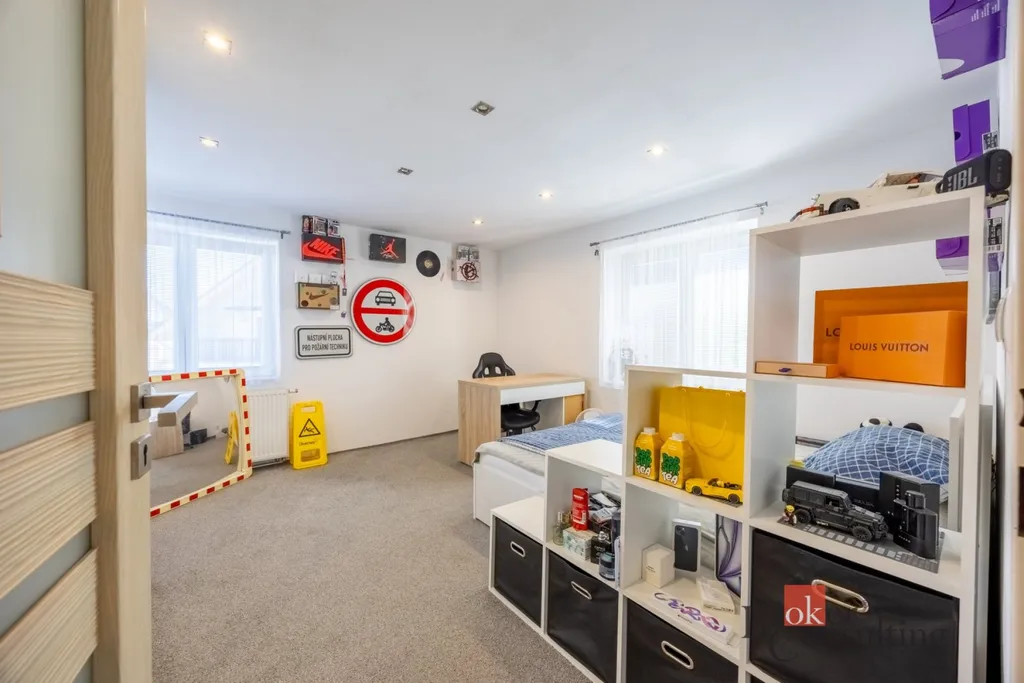 V patře se nachází klidová zóna domu. Je zde chodba s pracovním koutem ideálním pro home office, dále prostorná šatna, druhá koupelna s WC, komfortní ložnice a světlý dětský pokoj.