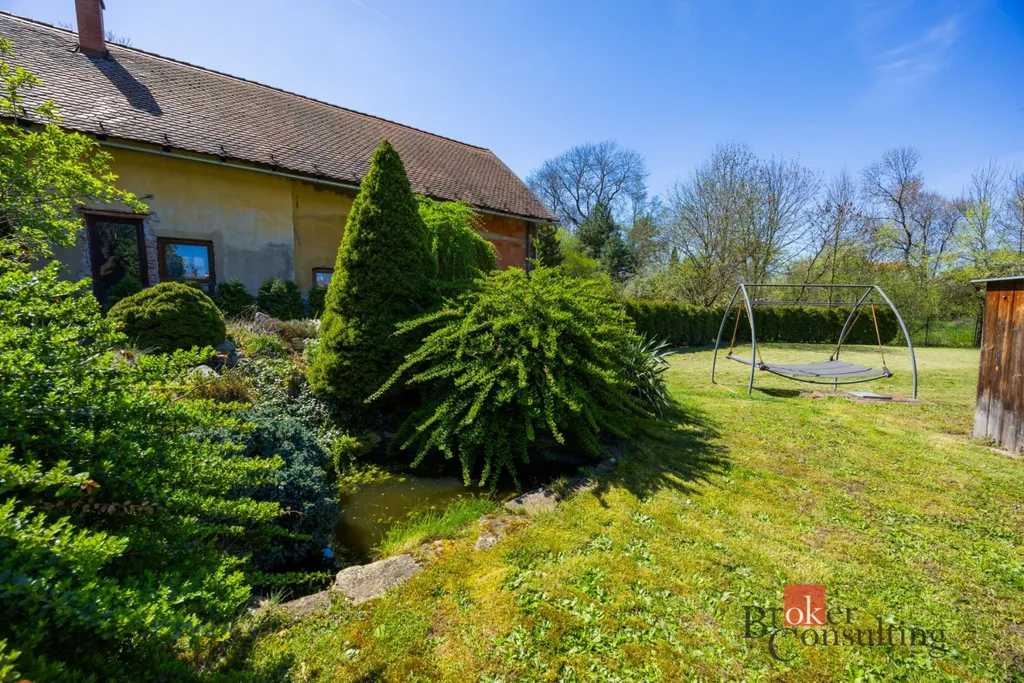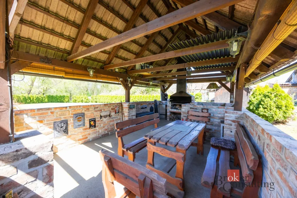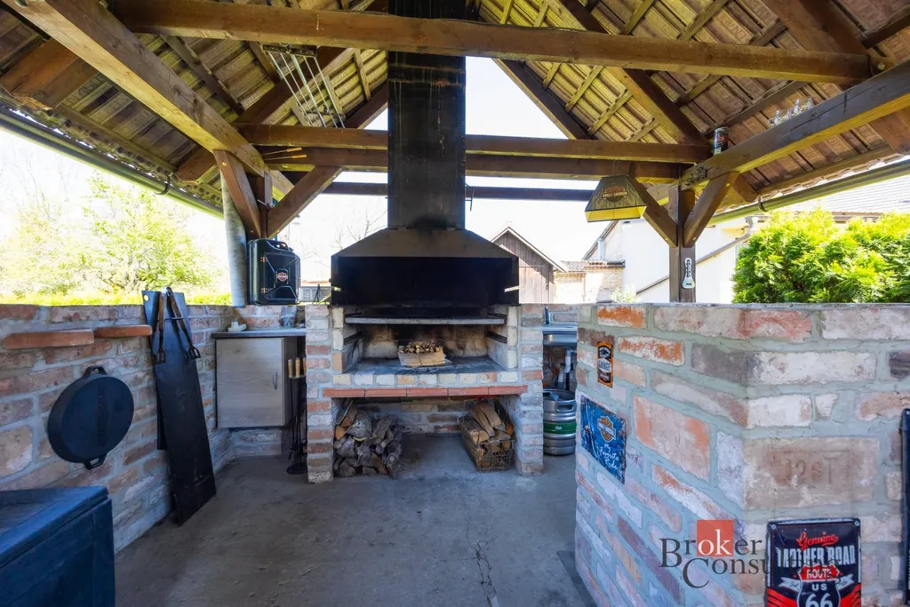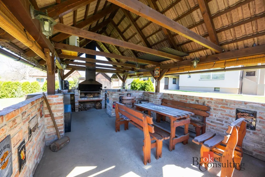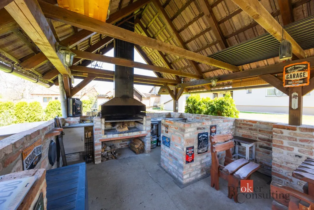 Dominantou zahrady je útulná pergola, která vybízí k posezení s rodinou či přáteli, dále udírna pro milovníky domácích specialit a zapuštěný bazén, ideální pro osvěžení v letních měsících.