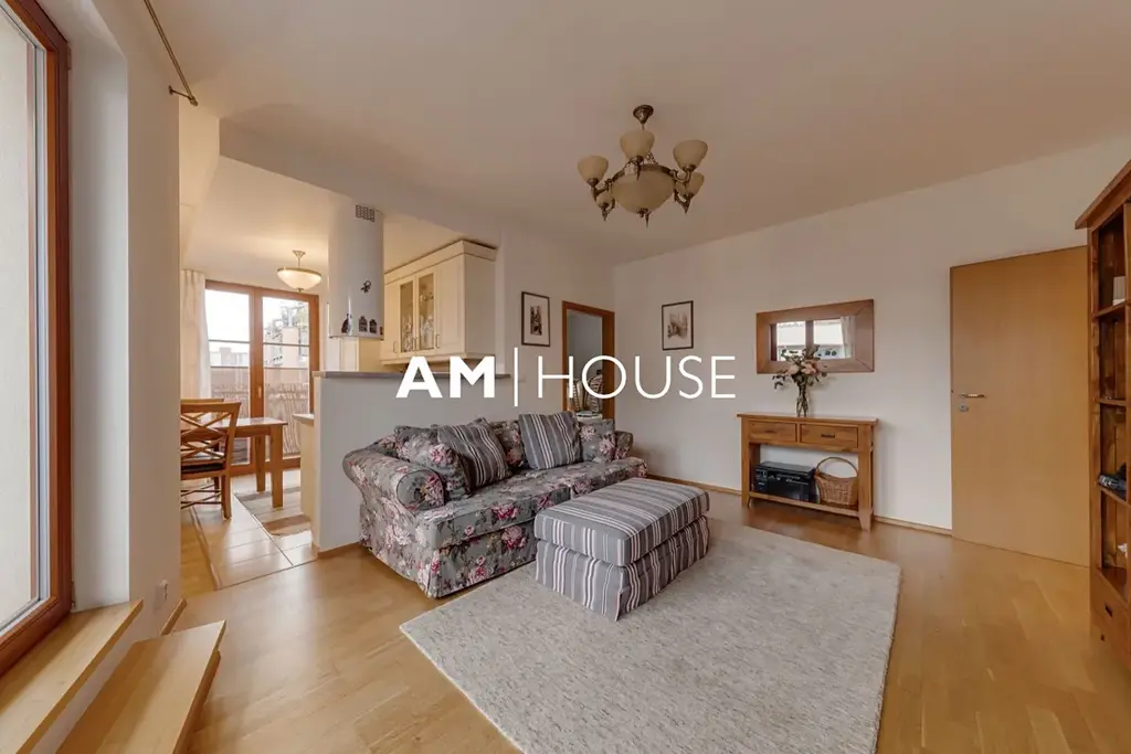 Promyšlená dispozice bytu nabízí 2 samostatné ložnice a prostorný obývací pokoj s moderním kuchyňským koutem a 2 koupelny.