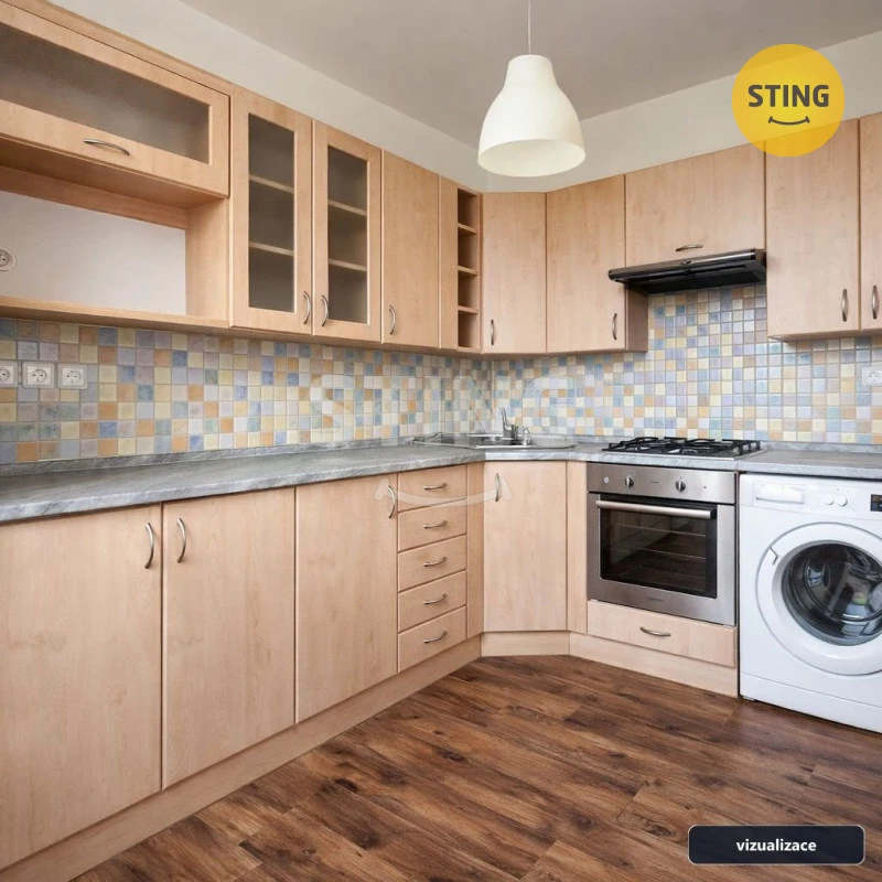 Bytová jednotka se skládá z chodby s praktickou vestavěnou skříní, prostorného obývacího pokoje, menší ložnice, samostatné kuchyně a koupelny s toaletou. Díky velkým oknům je byt krásně prosvětlený a působí velmi příjemným dojmem. Kuchyně je vybavena moderní kuchyňskou linkou na míru, která zahrnuje plynový sporák, digestoř, vestavěnou elektrickou troubu a lednici.Koupelna disponuje prostornou rohovou vanou, umyvadlem a koupelnovou skříňkou se zrcadlem. Součástí bytu je také sklepní kóje, která poskytuje dostatek úložného prostoru.