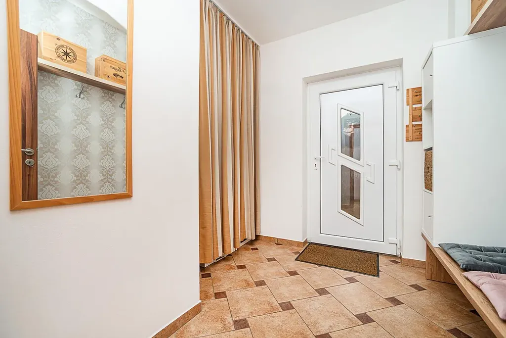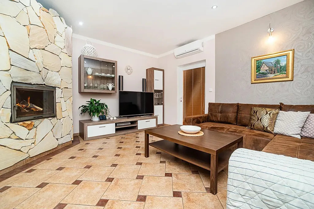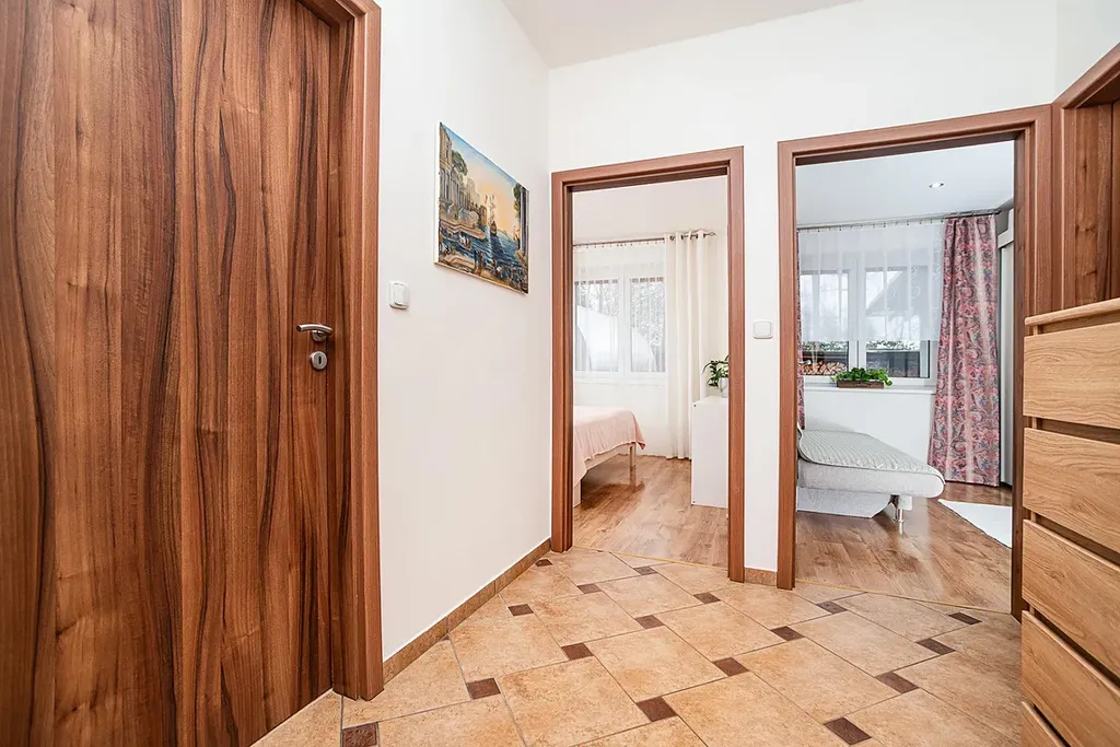 Dispozice domu zahrnuje prostorný obývací pokoj s krbem, moderní kuchyni s kuchyňskou linkou a kvalitními spotřebiči (myčka, trouba, mikrovlnná trouba, odsavač par), praktickou spíž, světlou ložnici, dva samostatné pokoje, technickou místnost, stylovou koupelnu se sprchovým koutem i rohovou vanou a samostatné WC. Komfort bydlení zvyšuje podlahové vytápění v celém domě a centrální vysavač. Americká lednice není součástí vybavení, je však možné se domluvit na jejím odkoupení. Kromě již zmíněného se dům pronajímá nevybavený.