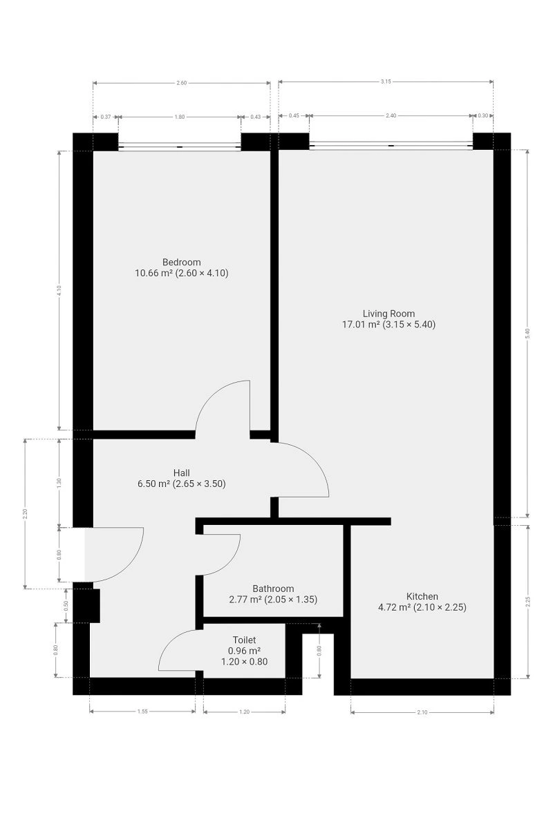 Skládá se z centrální vstupní chodby zařízené šatní skříní, samostatné koupelny vybavené sprchovým koutem, umyvadlem a pračkou, oddělené toalety a dvou pokojů - ložnice a obývacího pokoje, který je společný s kuchyňským koutem. Ten je vybavena malou lednicí, sklokeramickou varnou deskou, troubou a digestoří. Součástí kuchyně je také jídelní stůl.