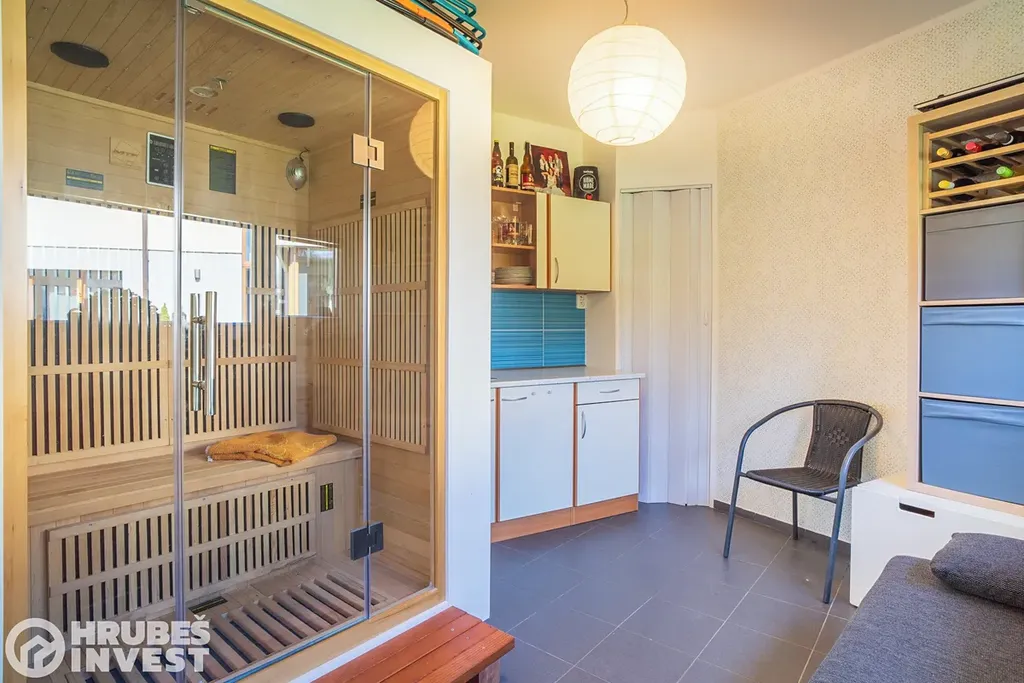Bazén je vytápěný soláry + vytápění a zastřešení (koupání cca 8 měsíců, otužilci celý rok ), na střeše je fotovoltaika (8,5 kW + baterka 13 kWh), v garáži připraven Val box, v domě je centrální vysavač a na zahradě automatické závlahy.
