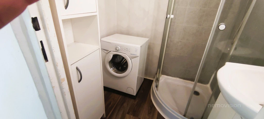 K dispozici je kuchyňská linka vybavená novým elektrickým sporákem, lednicí a mikrovlnnou troubou. V koupelně se nachází pračka. Byt je jinak nezařízený, součástí je pouze komoda a židle.