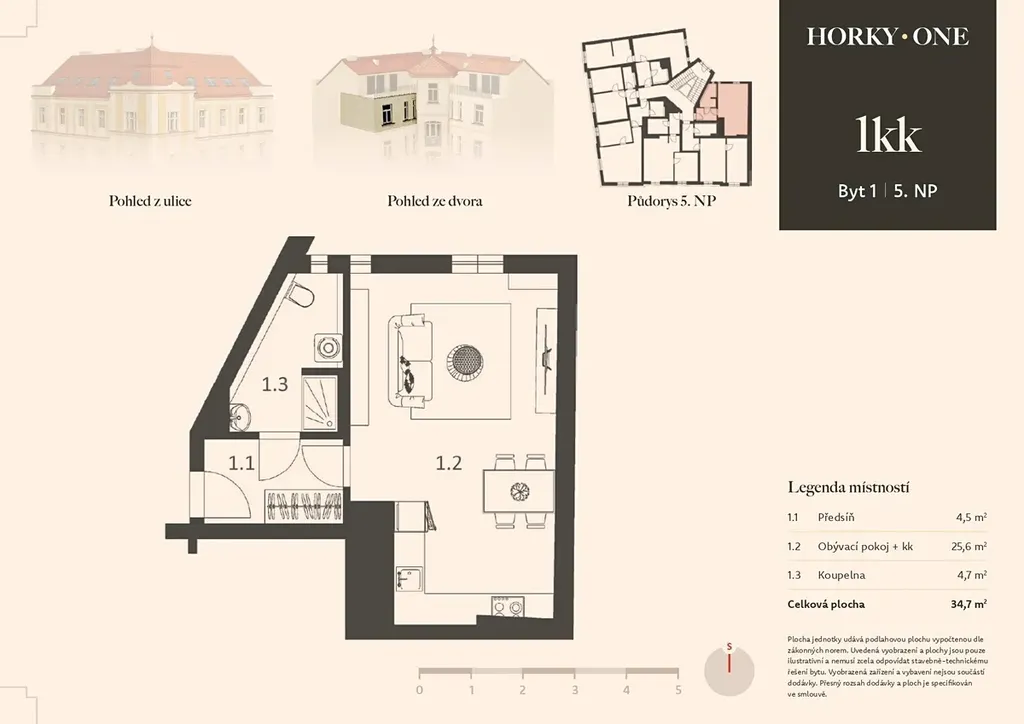 Novostavba o dispozici 1+kk a podlahové ploše 35 m² je součástí rezidenčního projektu HORKY ONE v pražských Nuslích. Celý dům prochází kompletní rekonstrukcí – zahrnuje novou fasádu, střechu, modernizaci rozvodů, instalaci výtahu i úpravy společných prostor, přičemž zachovává charakter původní architektury z počátku 20. století.