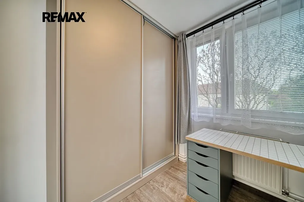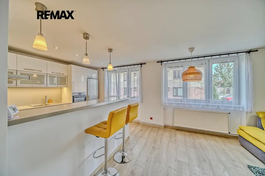 Součástí bytu je udržovaná kuchyňská linka s vestavěnými spotřebiči (lednice, trouba, varná deska, digestoř). Podlahy tvoří kombinace plovoucích podlah, dlažby a koberec. Stropy jsou zateplené a snížené sádrokartonem, což přispívá k vyššímu komfortu bydlení.