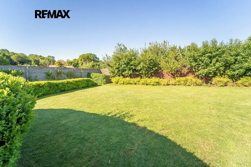 Zahrada nabízí naprosté soukromí a pohodu – je plná okrasných a ovocných stromů, s několika možnostmi posezení – buď na terase, nebo pod zastřešenou pergolou s krbem a grilem. O pravidelnou péči o trávník se stará automatická sekačka a zavlažování.