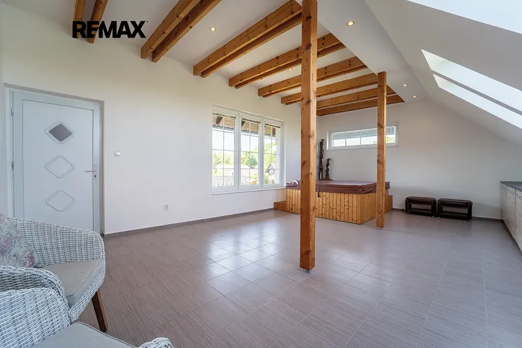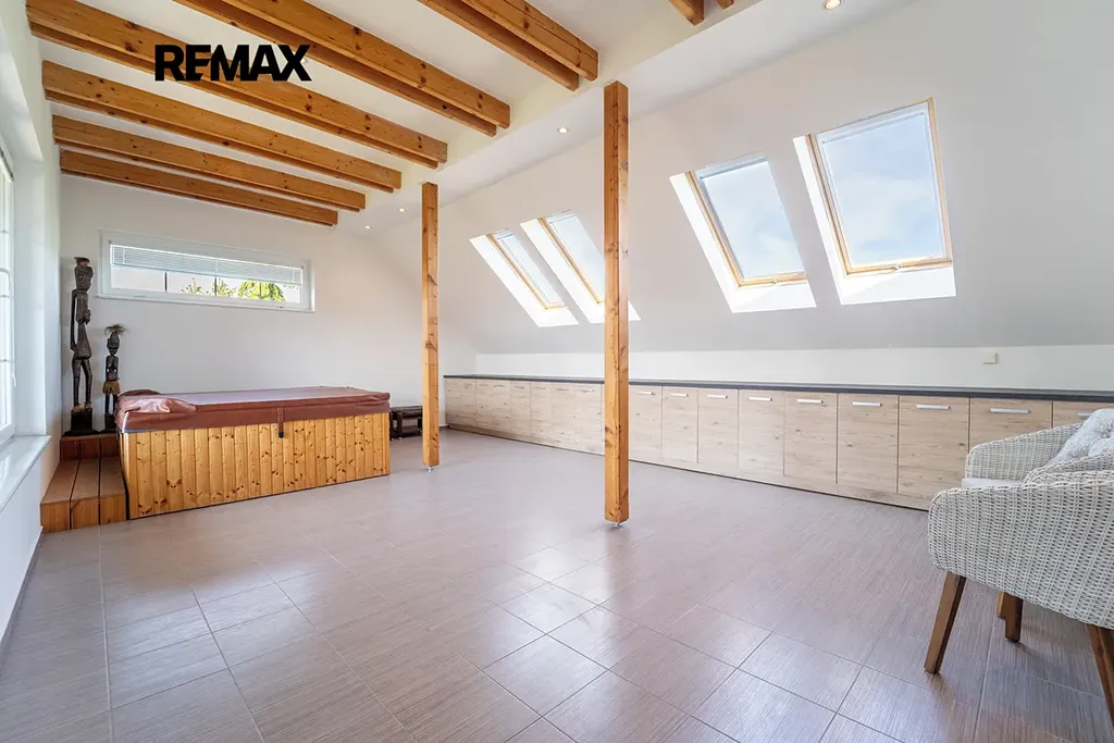 V patře se nachází samostatná místnost s vířivkou (Wellness) připravená pro domácí posilovnu s vlastním vstupem.