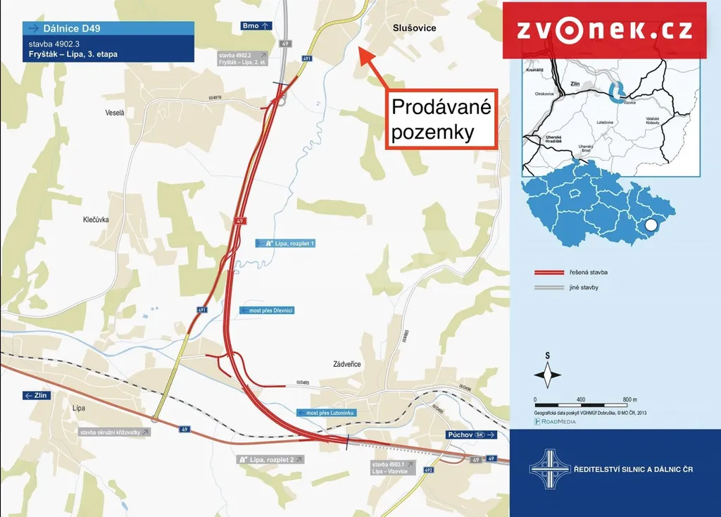 Pozemky se nachází cca 700m od plánovaného sjezdu z dálnice D49.