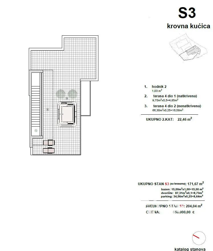 Jedná se o prostorný řadový dům s celkovou netto užitnou plochou 204,04 m², který je rozložen do tří podlaží. Díky trojpodlažnímu řešení působí nemovitost vzdušně, nabízí více soukromí a umožňuje komfortní rodinné i rekreační využití. V přízemí se nachází vstupní část, sklad, jedna ložnice, koupelna, moderní kuchyně s jídelnou a prostorný obývací pokoj s velkou posuvnou prosklenou stěnou. Ta otevírá přístup na krytou terasu s výhledem na moře a dále na soukromou zahradu s vyhřívaným bazénem o velikosti 15 m² a sluneční terasou.