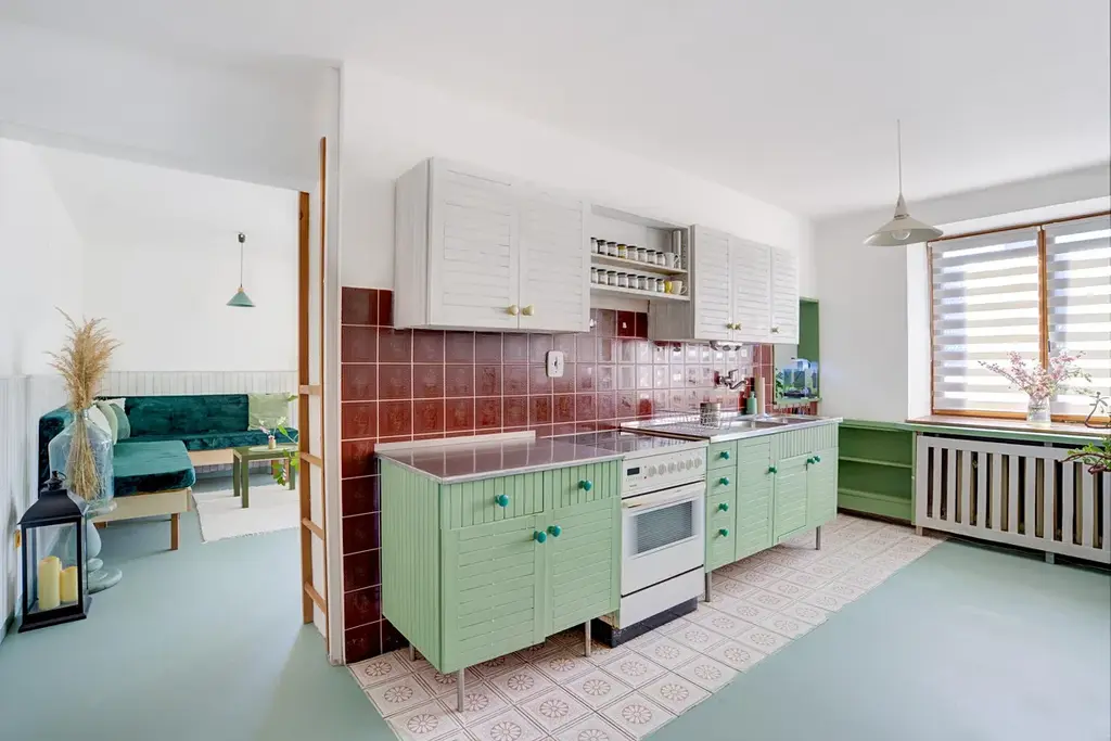 V přízemí (76 m2 + terasa 32 m2) je světlý obývací pokoj s kuchyní a spíží, ložnice, koupelna, wc a terasa orientovaná na jižní stranu s krásným výhledem na zahradu.