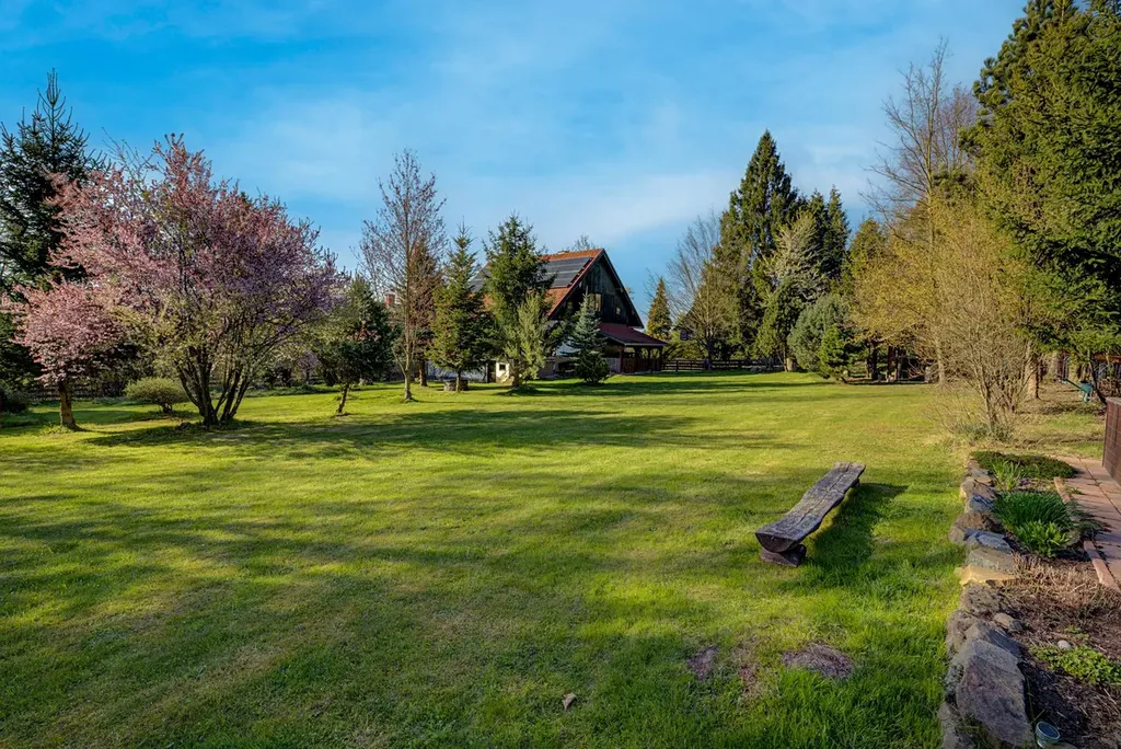 Zahrada je skoro rovinná, jsou zde vzrostlé okrasné keře a stromy, zahradní jezírko, kryté venkovní posezení a přístřešek na auto. Zahradní domek slouží k letnímu využití pro hosty nebo v zimě na uskladnění zahradního nábytku a nářadí.