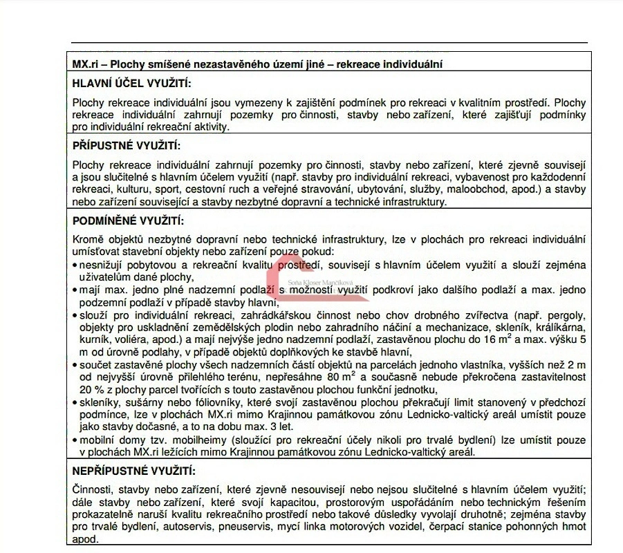 Dle veřejně přístupného územního plánu se jedná o plochu rekreace individuální (MRr.xi), kde je možné umístit stavby a zařízení pro rekreační využití. Přípustné jsou drobné stavby jako pergoly, zahradní domky, skleníky či zázemí pro zahradničení. Podmíněně lze realizovat rekreační objekty do jednoho nadzemního podlaží (s možností podkroví) při dodržení regulativů – maximální zastavěná plocha objektů na pozemku do cca 80 m² a zastavitelnost do 20 % plochy. Mobilheim je zde přípustný pro rekreační účely.
