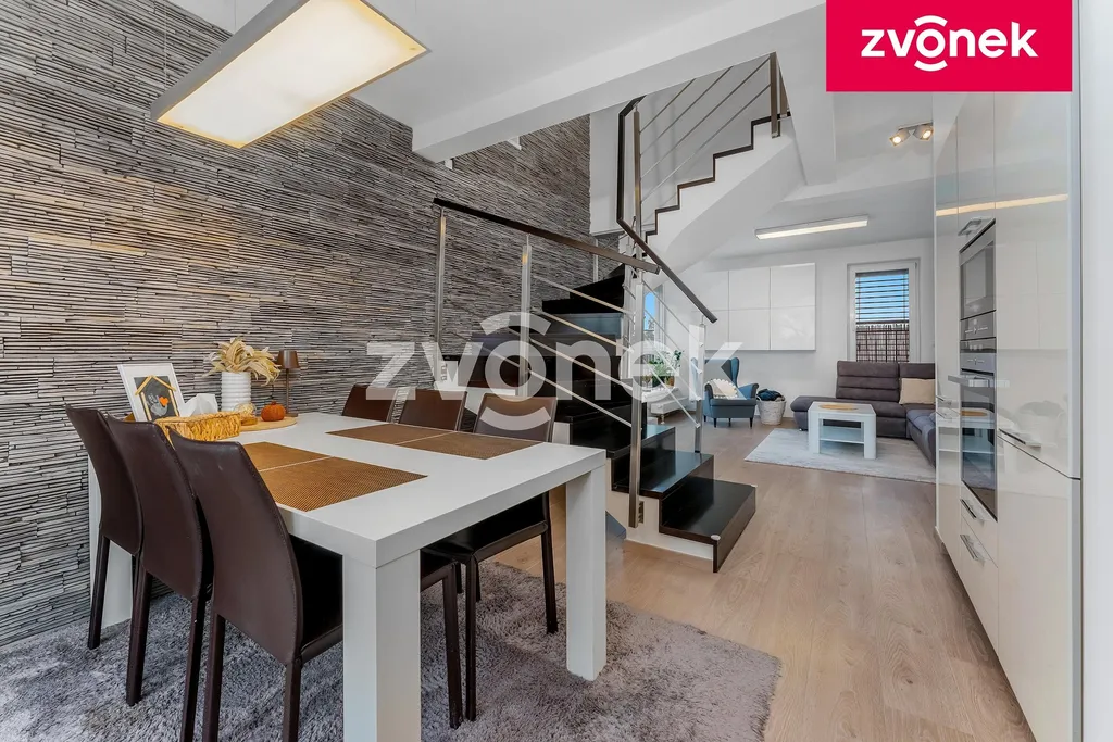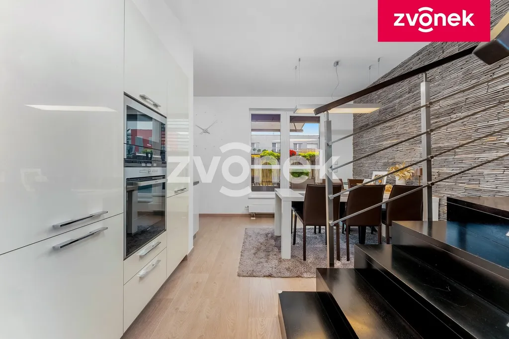 Dispozice bytu: zádveří s vestavěnými šatními skříněmi a vstupem na samostatné WC a do šatny s velkým množstvím úložných prostor. Obývací pokoj s jídelnou a kuchyní se vstupem na terasu a schodištěm do horní části bytu. Kuchyň je plně vybavena vestavěnými značkovými spotřebiči / elektrická trouba, mikrovlnná trouba, myčka na nádobí, lednice s mrazákem, digestoř|/ díky důmyslnému a promyšlenému řešení kuchyň nabízí velké množství úložných prostor jako je např. potravinová skříň s drátěným programem atd. Na rohové terase o ploše 37 m2 se nachází markýza, zahradní posezení, dětský koutek. V jídelně je umístěn velký jídelní stůl se židlemi. Stěna v jídelně a na schodišti je obložena přírodním kamenem. Z obývacího pokoje je vstup do horní části bytu schodištěm s nerezovým zábradlím. V horní části bytu se nachází chodba opět s vestavěnými skříněmi, se vstupem do ložnice se šatnou nabízející velké množství úložných prostor, dětského pokoje a koupelny se sprchovým koutem, společným WC a šatny s úložnými prostory. Všechny pokoje a místnosti jsou vybaveny na zakázku vyrobeným značkovým nábytkem a skříněmi, tyto jsou součástí ceny bytu. Ve všech oknech jsou umístěny elektricky ovládané venkovní protisluneční žaluzie. Byt je ve velmi udržovaném stavu odpovídající téměř novostavbě. K bytu náleží prostorná sklepní kóje o ploše 33,5 m2. Byt se nachází ve velmi klidné části bytové zástavby v lokalitě Kasárna. V blízkosti bytu se nachází, obchodní centrum, městské sportoviště, cyklostezka, dětské hřiště, škola, školka, aqua park, zimní stadion. Centrum města je vzdáleno do 8 min. pohodlnou chůzí. V bezprostřední blízkosti bytového domu je dostatek parkovacích míst. Byt je volný ihned.