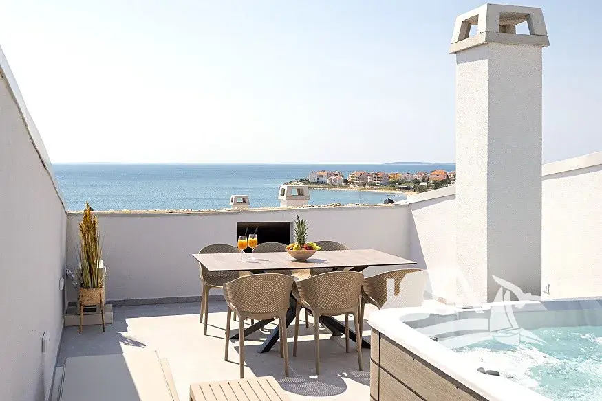 Dominantou celé nemovitosti je soukromá střešní terasa, která vytváří prostor, kam se budete vracet každý den. Výhled na otevřené moře, dostatek soukromí a vlastní vířivka dávají tomuto místu charakter, který se běžně nehledá, ale když ho jednou zažijete, nechcete o něj přijít. Je to místo pro klid, setkání i chvíle, které si člověk pamatuje.