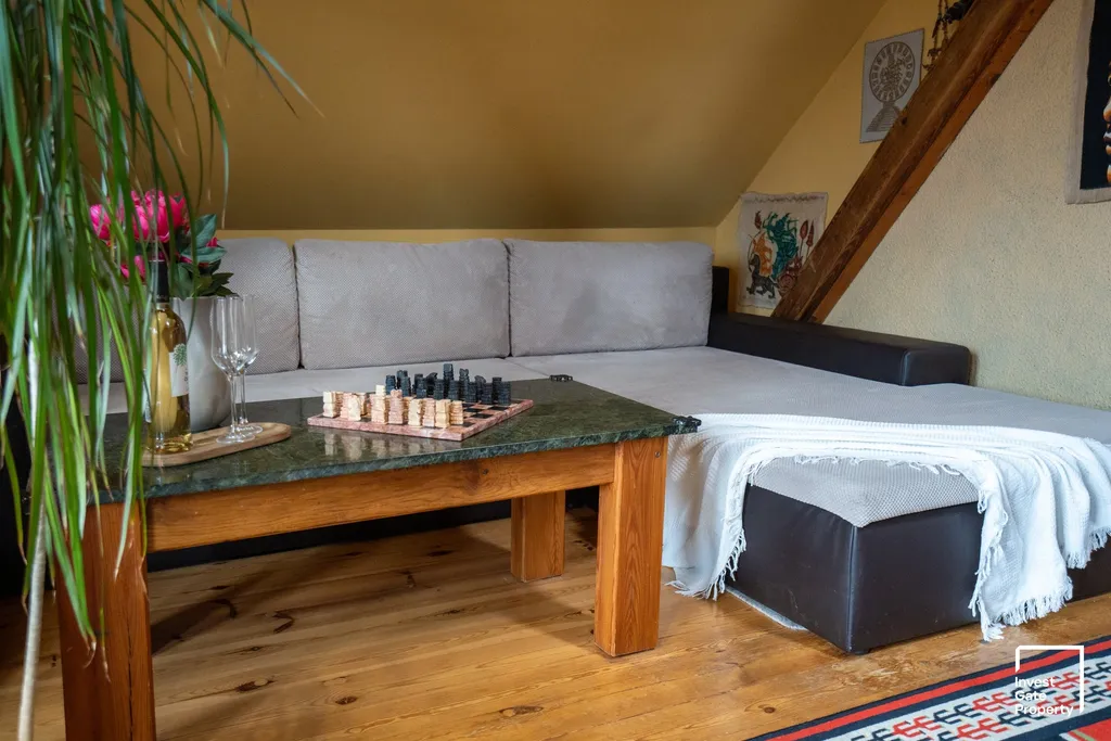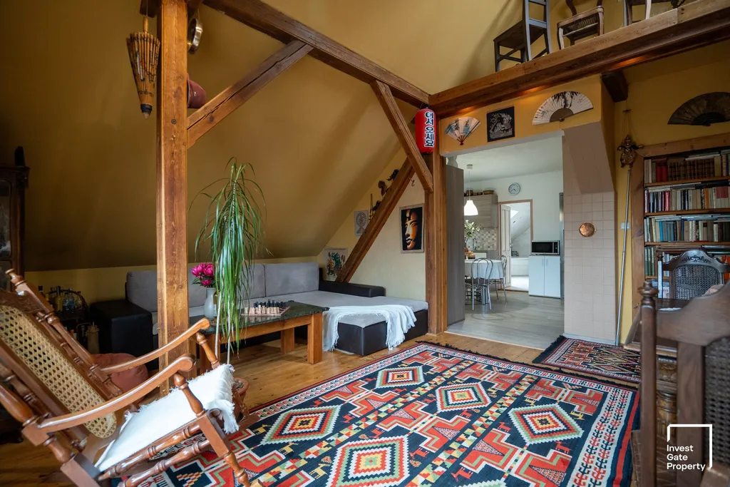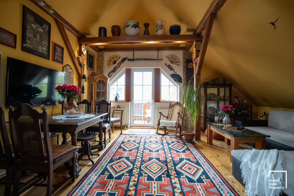V patře domu se nachází bytová jednotka o dispozici 4+kk a výměře cca 90 m². Ta nabízí flexibilní využití – může sloužit jako komfortní zázemí pro majitele, nebo ji lze přeměnit na další prostorný apartmán pro rodiny s dětmi a dále tak rozšířit ubytovací kapacitu. V podzemním podlaží pak najdete útulné posezení s krbem a kuchyní, ideální pro společné chvíle hostů či rozšíření služeb.