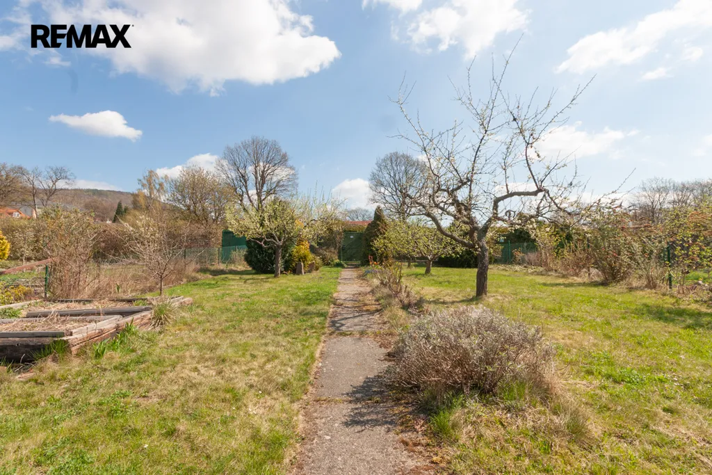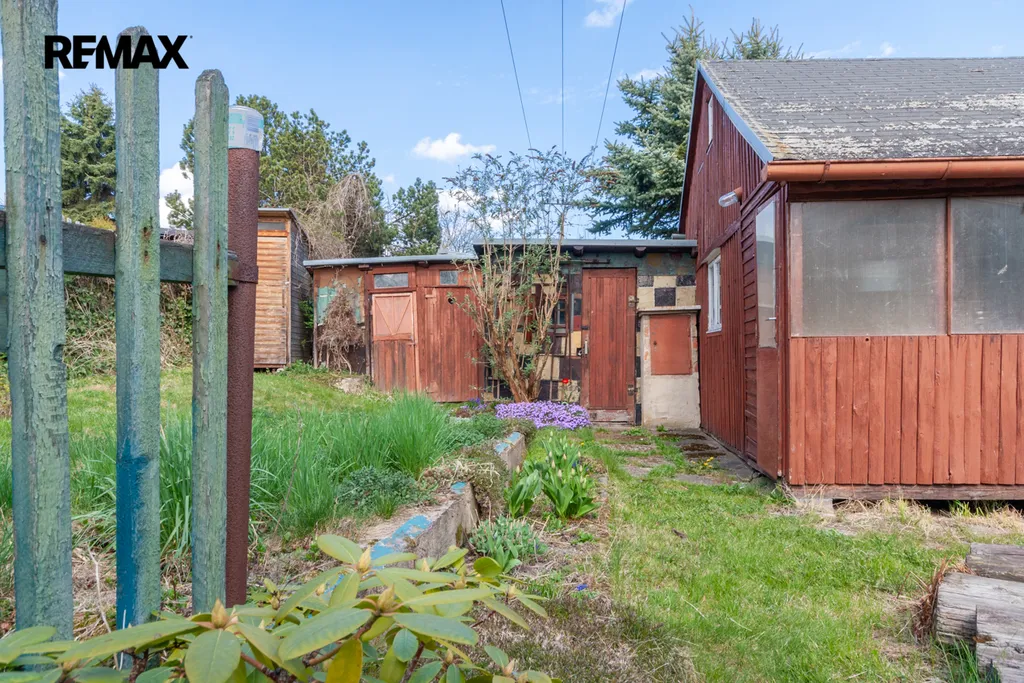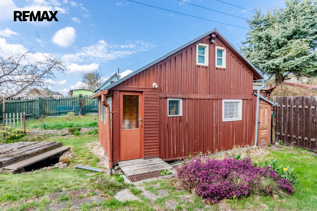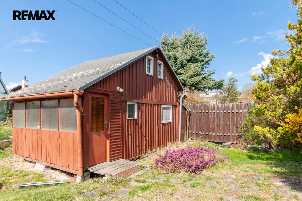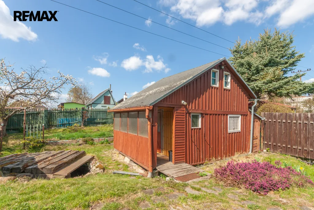 Součástí zahrady je zahradní nepodsklepená chata s podkrovím. V přízemí je veranda, víceúčelová místnost s kuchyňským koutem, šatna a schodiště do podkroví. V podkroví je místnost využívaná jako ložnice. Na chatu navazuje místnost na zahradnické nářadí. Naproti chatě je do terénu usazený velmi kvalitní sklep, kde vám ovoce i zelenina vydrží od podzimu až do pozdního jara. Vedle sklepu je místnost s lázeňským kotlem k osprchování.