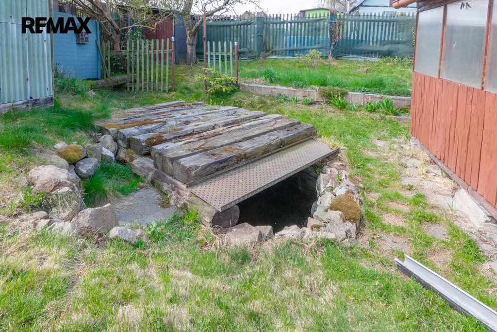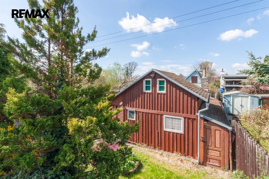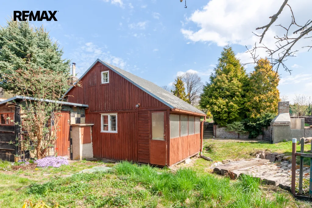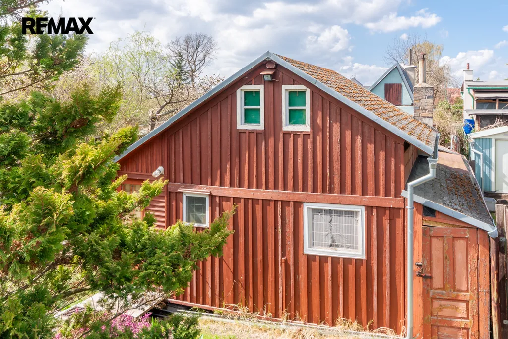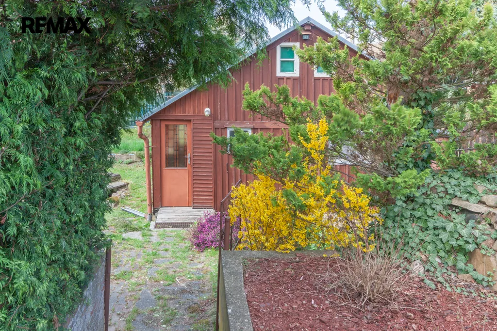 Součástí zahrady je zahradní nepodsklepená chata s podkrovím. V přízemí je veranda, víceúčelová místnost s kuchyňským koutem, šatna a schodiště do podkroví. V podkroví je místnost využívaná jako ložnice. Na chatu navazuje místnost na zahradnické nářadí. Naproti chatě je do terénu usazený velmi kvalitní sklep, kde vám ovoce i zelenina vydrží od podzimu až do pozdního jara. Vedle sklepu je místnost s lázeňským kotlem k osprchování.