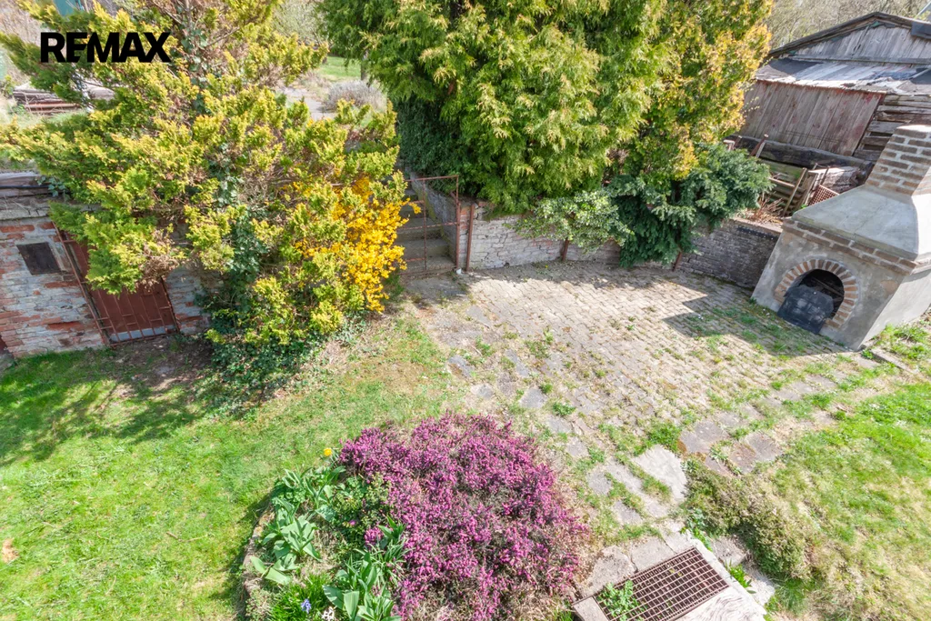 Zahrada je terasovitě rozdělená opěrnou zíďkou a schody na odpočinkovou část s posezením u zahradního krbu, a užitkovou část s ovocnými stromy a záhony. Terasa se vzrostlou zelení zajištuje dostatek soukromí.