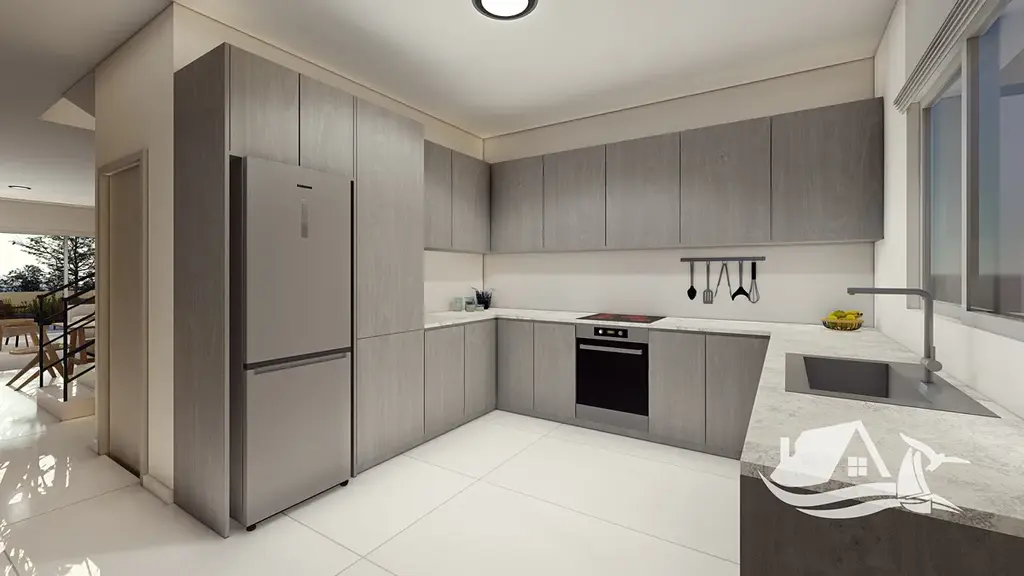 Obytná část je promyšleně řešena a přirozeně navazuje na krytou verandu, která rozšiřuje obytný prostor a nabízí ideální místo pro relaxaci, posezení s rodinou či přáteli nebo klidné chvíle v příjemném kyperském klimatu. Praktické řešení bytu doplňuje kryté parkovací stání a kvalitně navržené společné prostory, které podtrhují celkový rezidenční charakter projektu.