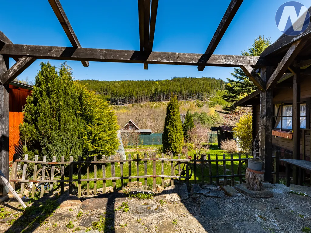 Velkou výhodou je také venkovní zázemí. U chaty se nachází terasa s pergolovou konstrukcí, která je připravena k dokončení zastřešení. Právě tady si lze jednoduše vytvořit krásnou odpočinkovou zónu pro posezení, grilování nebo letní večery s rodinou a přáteli.