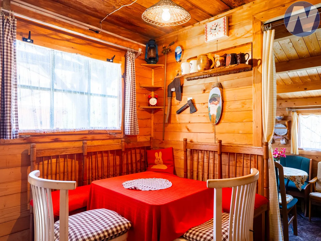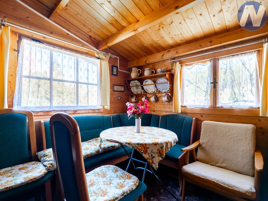 Součástí zahrady je udržovaná chata s obytným zázemím, která je suchá, čistá a dodnes pečlivě opečovávaná. Uvnitř nabízí příjemné dřevěné zázemí s posezením, vybavením a atmosférou klasické chaty, kam přijedete, zavřete za sebou dveře a okamžitě zpomalíte. V chatě je zavedena elektřina a možnost vytápění kamny, takže ji lze využívat i mimo hlavní letní sezónu.