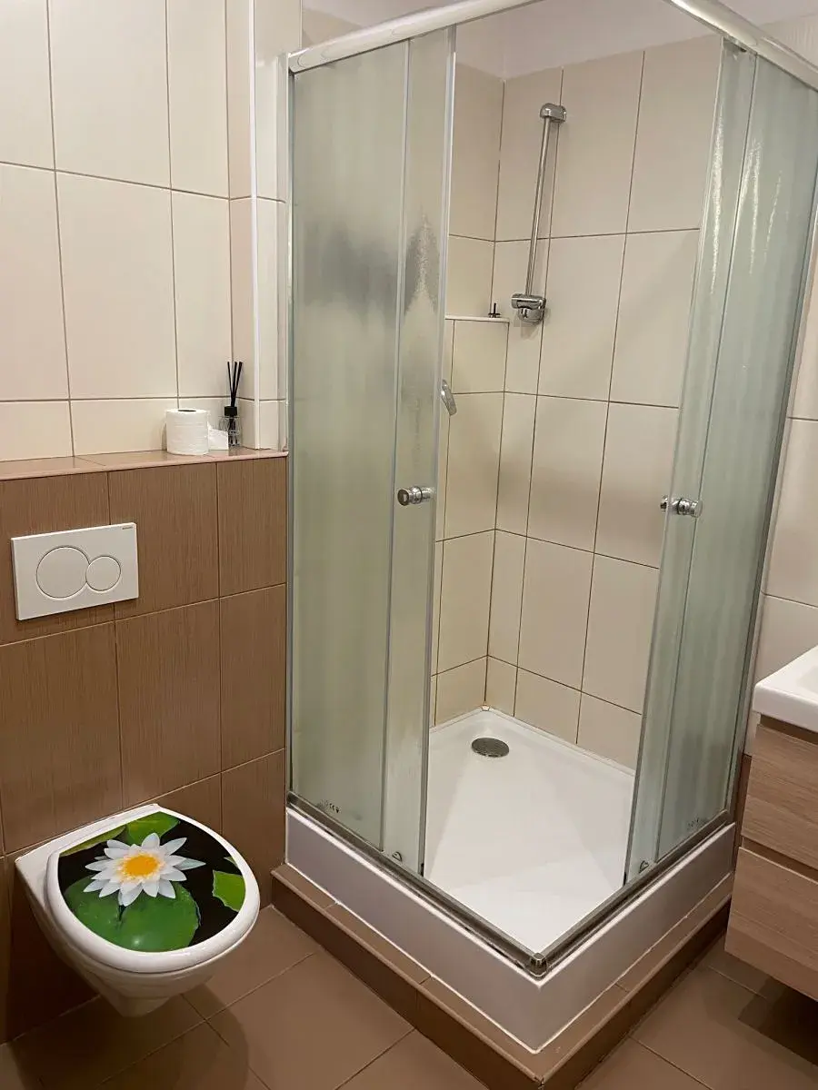 lednice, mikrovlnná trouba. Pračka se sušičkou je na patře ve společné