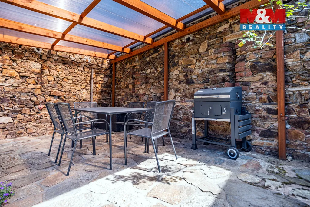 Za nenápadnou fasádou se otevírá klidný uzavřený dvůr se zahradou o velikosti 695 m², kde si můžete vychutnat ranní kávu na kryté terase, odpočinout si u jezírka a užívat si zeleň s automatickou závlahou, retenční nádrží i vlastní studnou.