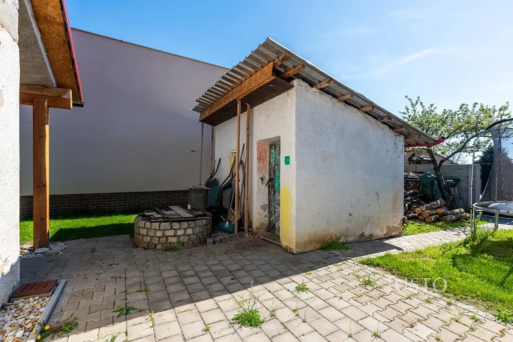 V zadní části domu je malá zděná šopa, - zemědělská stavba která sice je ve vlastnictví České republiky, ale pozemek pod stavbou je ve vlastnictví majitele nemovitosti.